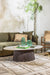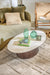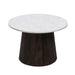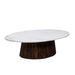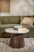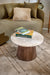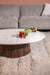 שולחן עץ מנגו דגם פרומיס המורכב מפלטת שיש עגולה בגוון בהיר ונישאת על רגל עץ נמוכה. פריט ריהוט מרשים המורכב ממרקמי הטבע והניגוד הגלום ביניהם. שולחן בקו עגול מסדרת הריהוט המתוחכם.
