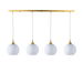 גוף תאורה משולב פס מתכת עם ארבע כובעי זכוכיות לבנות על כבל לתלייה מהתקרה.